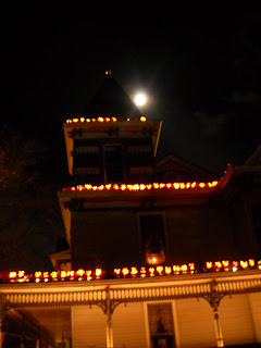 Like I mentioned in the last post , people around these parts really get into the holidays this time of year. About 15 years ago I worked with a Psychologist who told me that I needed to drive by her house that she and her husband decorated with hundreds of pumpkins. I did and it was a sight! Fast forward 15 years and I could not believe my eyes what it has transformed into! The Griffiths now decorate with not hundreds but THOUSANDS of pumpkins! There were probably a THOUSAND people there to see their house! It has turned into a whole community event. Everyone pitches in to carve the pumpkins. They were selling food and tshirts last night! They now use the inside of all the pumpkins to make pumpkin butter, pumpkin bread, and pumpkin cookies. All the proceeds go to the local food shelter. They have a huge wall set up beside their house that is 2 stories high and about 30 feet long. It is full of pumpkins with musical instruments carved into them. They play music and there is a light show choreograped with the music. So for example if there are brass instruments playing all the brass instrument pumpkins will light up. Truly spectacular! This year they even added a show. The news anchor from the local television station was there reading a story about the headless horseman. In part of the story she had everyone turn around and look. Across the river and up the mountain flood lights appeard and so did the headless horseman on a real horse of course. The Pumpkin House was even featured on the Ellen Degeneres show last year. The Pumpkin House has come a long way in 15 years. I dont know how they have the time to do it all. Sandy still works as a psychologist and her husband Rick owns a pharmacy and is the mayor of the town! One thing is for sure, they have really instilled a sense of community- which I LOVE! Thanks Rick and Sandy! Now for some pics which REALLY does NOT even touch what it is like to be there and experience it first hand.